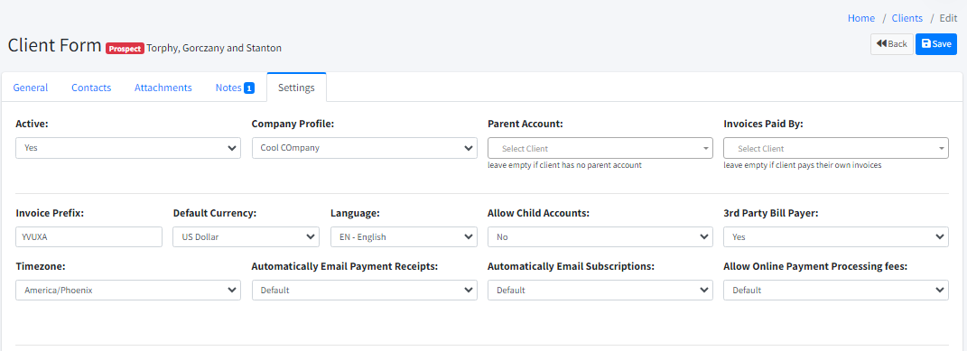 - Language - this will change the language in which their invoices are displayed as well as the language that is displayed when the client logs into the Client Center.