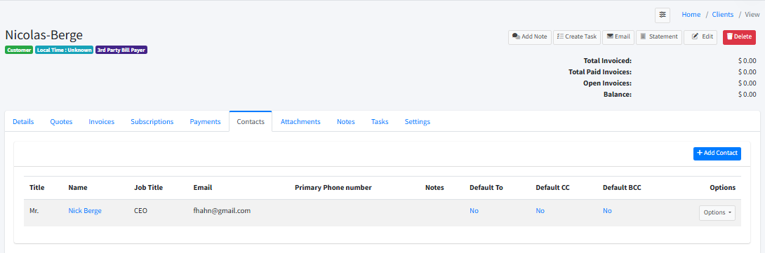 A single client record may represent a company with multiple contacts—each with their own phone numbers and email addresses. Adding these individuals as contacts makes it easier to communicate with the right person.