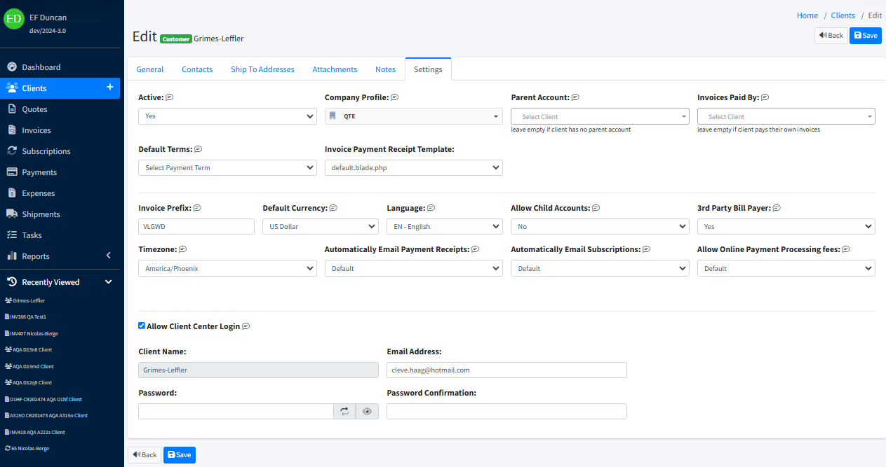 To create a login for a client, go to their account and enter Edit mode. Under Settings is a checkbox to enable the Client Center. Once checked you can create their login password. The password has a minimum character limit of 6 and a maximum character limit of 16. Their login username will be the email attached to their account.